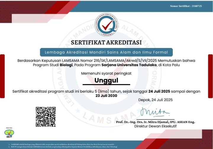 Berdasarkan Keputusan Lembaga Akreditasi Mandiri Sains Alam dan Ilmu Formal (LAMSAMA) Nomor 216/SK/LAMSAMA/Akred/S/VII/2025, memutuskan bahwa Program Studi Sarjana Biologi, Universitas Tadulako, Palu terakreditasi dengan peringkat : UNGGUL, berlaku sejak 24 Juli 2025 sampai dengan 23 Juli 2030
